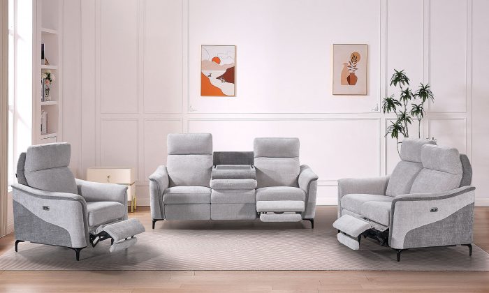 Photo d'un salon présentant deux canapés de la même collection. Les canapés sont revêtus d'un tissu rouge bordeaux avec de petites nuances de noir et de blanc. L'ensemble est composé d'un canapé 2,5 places et d'un canapé 2 places, tous deux équipés d'une fonction de relaxation électrique et d'appuie-têtes réglables manuellement.