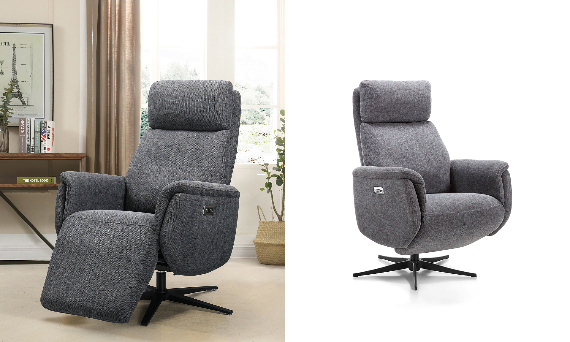 Revêtement tissu ou microfibre 100% polyester. Structure bois massif. Suspension assise ressorts métalliques zig-zag et dossier sangles haute résistance. Mousse polyuréthane assise 30 kg/m3, dossier et accoudoirs 22 kg/m3. Port USB. Têtière manuelle.